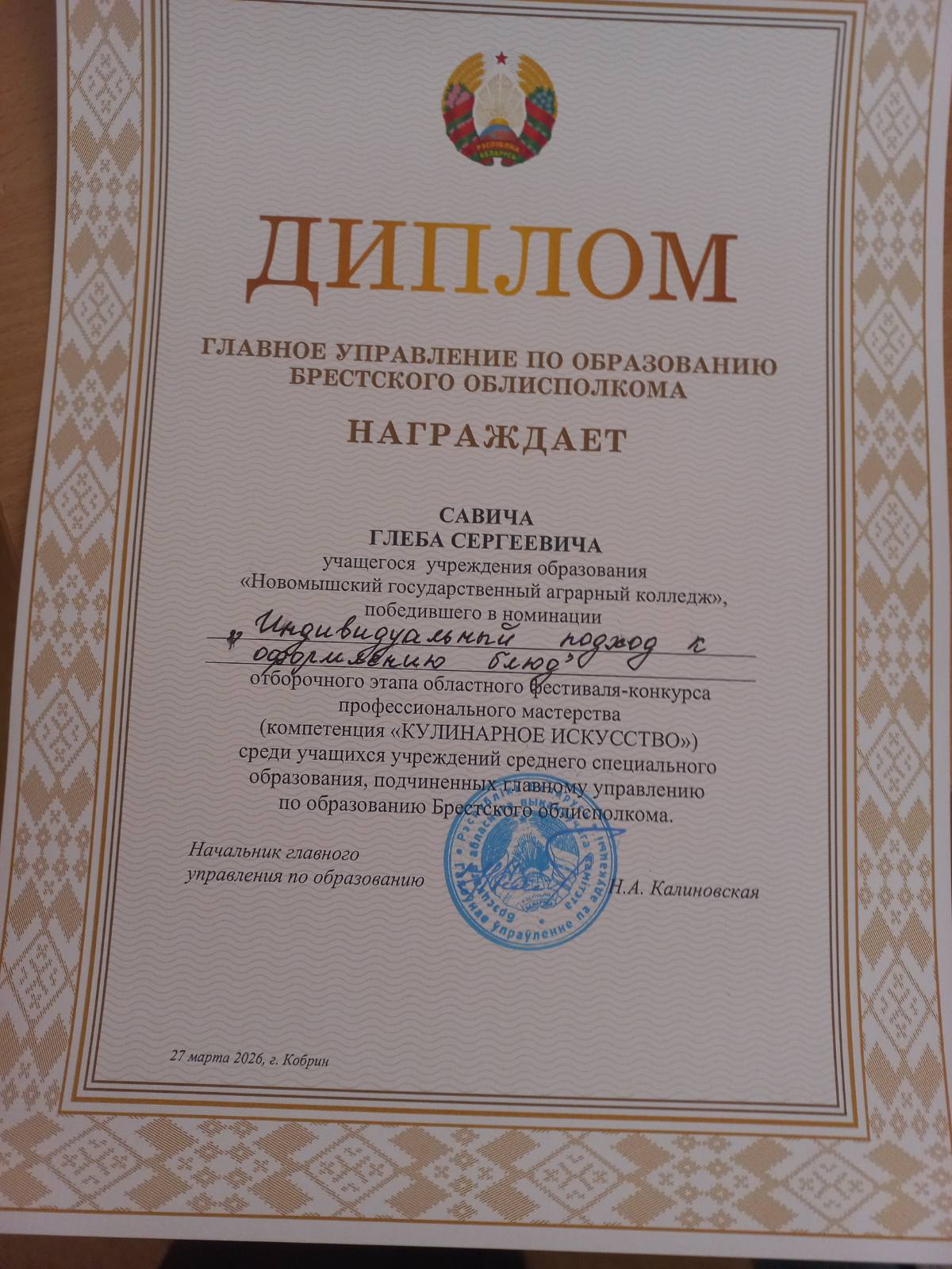 По сумме баллов Савич Глеб занял достойное 5 место и был отмечен Дипломом главного управления по образованию Бресткого облисполкома в номинации «Индивидуальный подход в оформлении блюд».