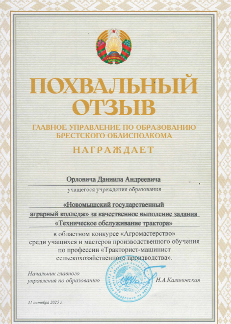 Похвальным отзывом главного управления по образованию Брестского облисполкома за высокое качество выполнения задания награжден «Техническое обслуживание трактора» – Орлович Даниил Андреевич, учащийся учебной группы № 295. Мастер производственного обучения Сычик Евгений Александрович и учащийся Орлович Даниил Андреевич заняли пятое общекомандное место среди 11 участников.