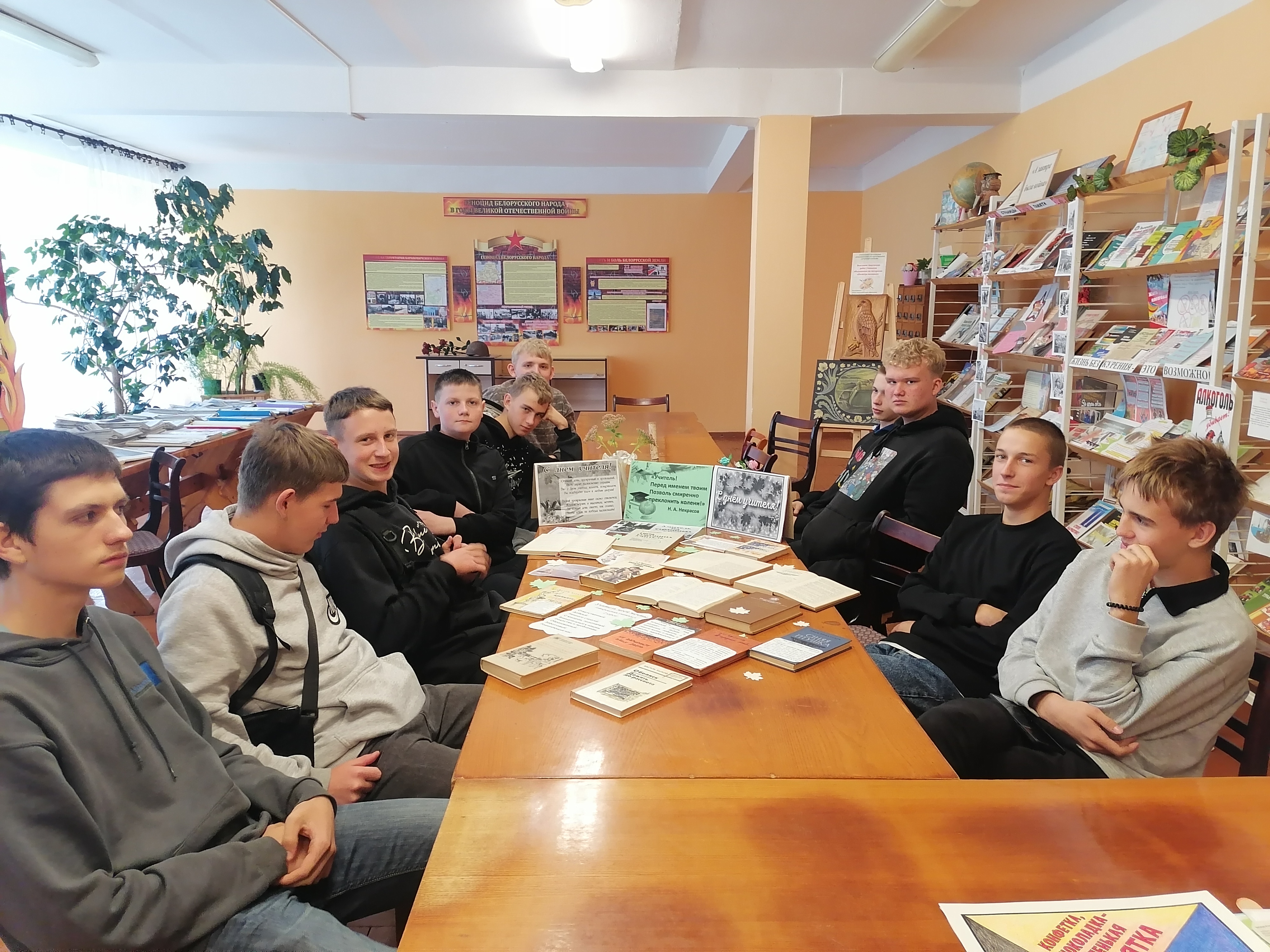 В преддверии этого праздника, в библиотеке колледжа оформлена выставка-путешествие «Учитель! Перед именем твоим…». на которой представлены высказывания знаменитостей о Великом Предназначении учителя, откровения учащихся на тему «Учитель моей мечты», сделана подборка художественные произведений, раскрывающих перед читателями многогранный образ учителя, повествующих о трудовых буднях педагогов, о находках и открытиях, о смысле жизни, о любви, о порядочности и человечности, которые так необходимых всем нам. Все эти многогранные темы затронуты в аннотированных романах и повестях «Уроки французского» В. Распутина, «Первый учитель» Ч. Айтматова, «Не запирайте дверь» Т. Упенской, «Абелиск» В. Быкова, «Учитель словесности» А. Чехова, «Сельскія настаўнікі», «Школьны хлеб» Я. Гуцала, “Сіняя птушка” Я. Ермаловіча, «В середине лета» О. Фомченко и др.